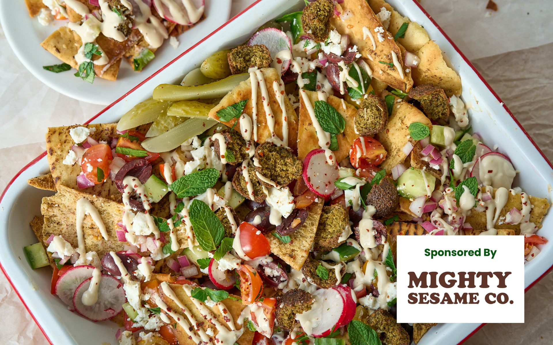 These pita nachos put a Mediterranean spin on classic nachos, layering crispy za’atar pita chips with crunchy falafel, fresh vegetables, and briny olives and feta. A lemony drizzle of Mighty Sesame Tahini ties everything together, while herbs and spices add brightness and bite. Perfect for sharing, this platter is bold, fresh, and snackable. Chef instructor: Diana